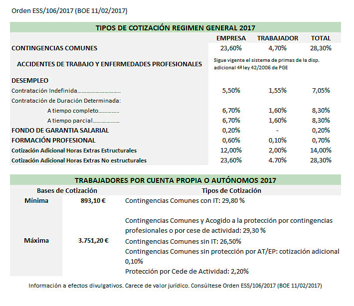 Con algunos días de retraso sobre la fecha que suele ser tradicional, en el BOE del día 11 de febrero de 2017, se ha publicado la Orden ESS/106/2017, de 9 de febrero, por la que se desarrollan las normas legales de cotización a la Seguridad Social, desempleo, protección por cese de actividad, Fondo de Garantía Salarial y formación profesional para el ejercicio 2017.